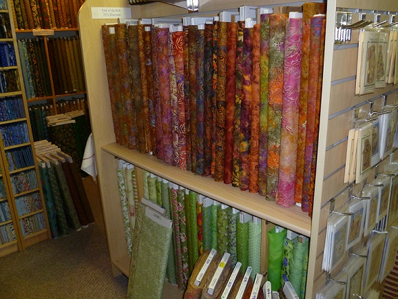 Here’s where I like to indulge myself: in the batik section of my favorite quilt fabric shop, B&B Quilting and Gifts in Buda, Texas. When I win the lotto (by either finding the winning ticket on the ground or someone leaving it on the windshield my vehicle), I’m going to walk into the shop and say, “I’ll take one yard of every bolt!”