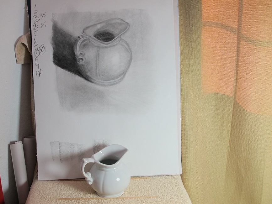 Pitcher small round (1s) Published November 12, 2014 at 867 × 651 in Round Pitcher in Charcoal Putting the sketch up on the bench makes the angle look different Curlicue pitcher and sketch