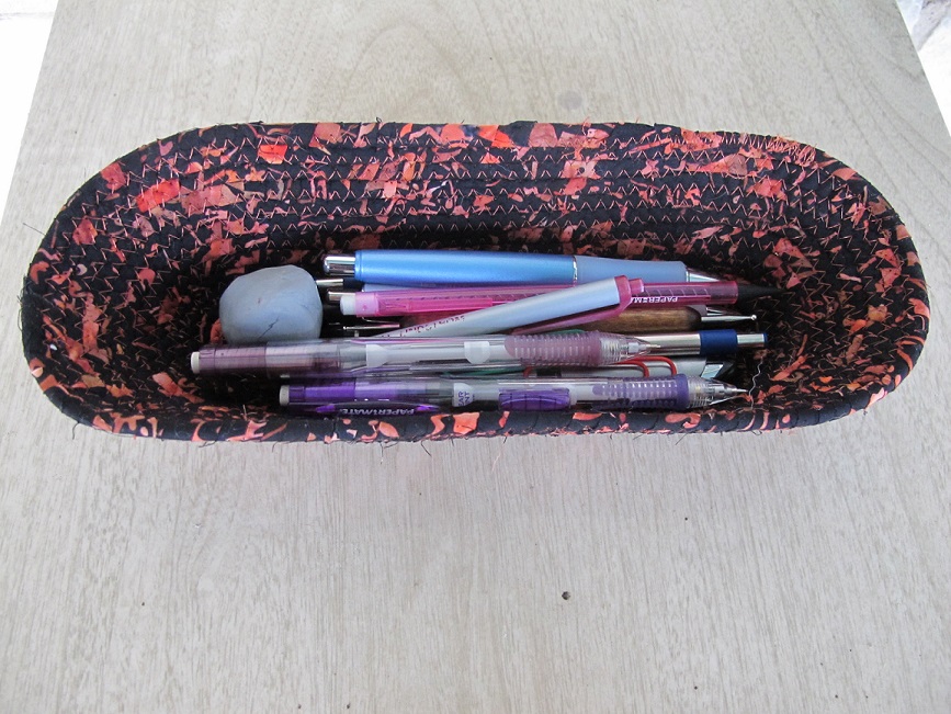 Fabric bowl 2015 02 04 (2s) Published February 4, 2015 at 867 × 651 in Quilt Leftovers Already in use Bowl with pens