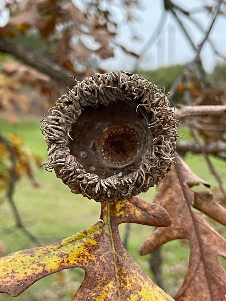 In the summer, I could see lots of baby acorns on our Burr Oak tree. By autumn, they had mostly disappeared. I found this one acorn shell; proof positive of at least one.